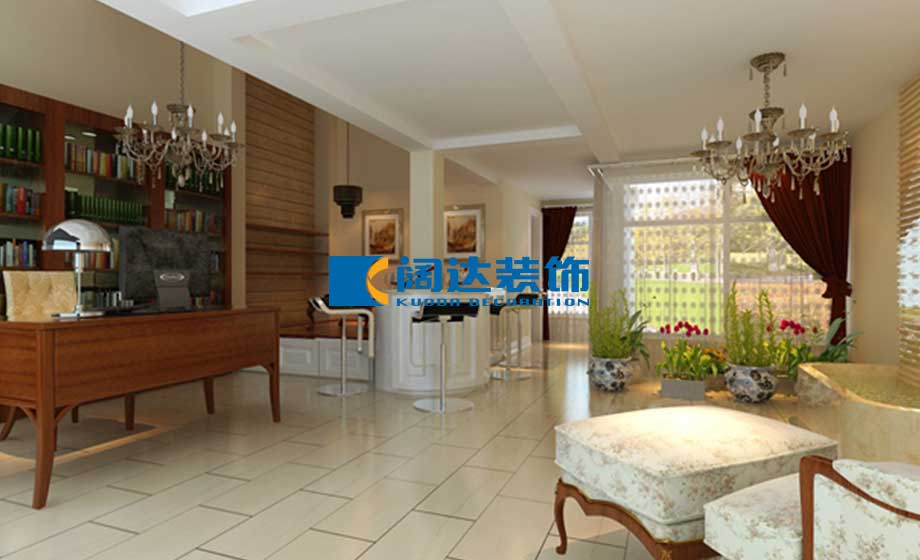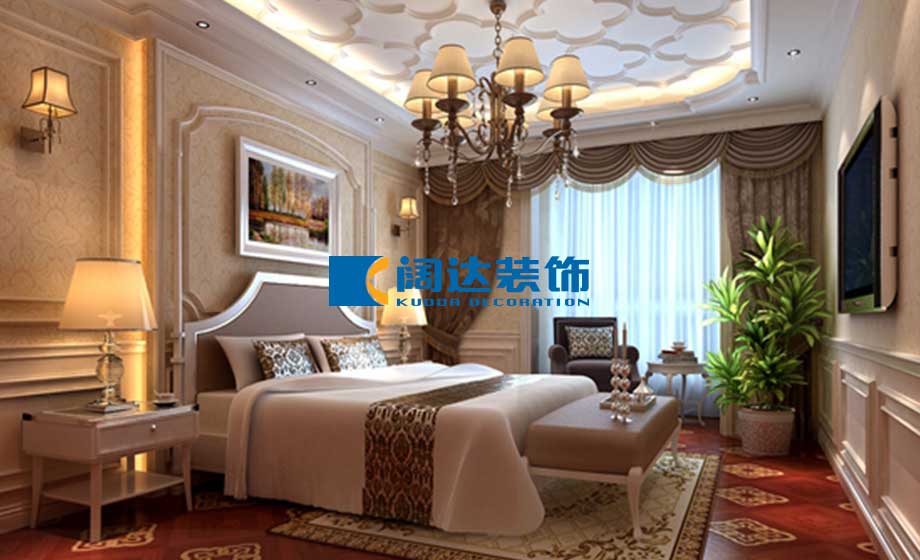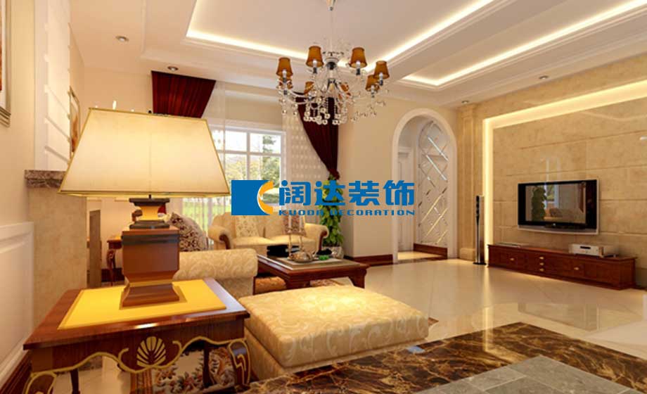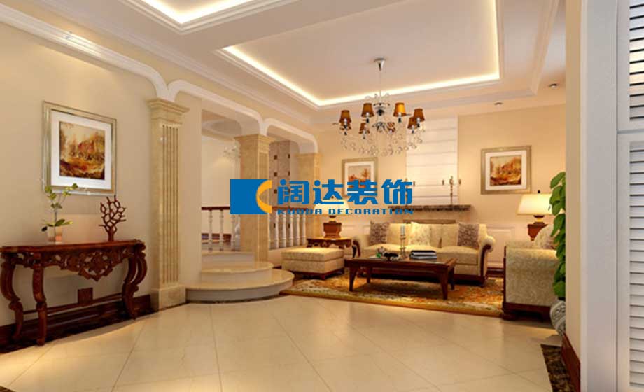 本案設計采用了簡化的美式線條造型墻板,與天棚的線條框渾然一體,覆以純凈的白色,顯得更加明快,格調端莊典雅。配合美式經典家具,讓空間頗有內涵與品位。地面為西班牙米黃石材結合咖網紋波打線,多種元素的混搭所營造的精致場景尤顯奢華富麗。