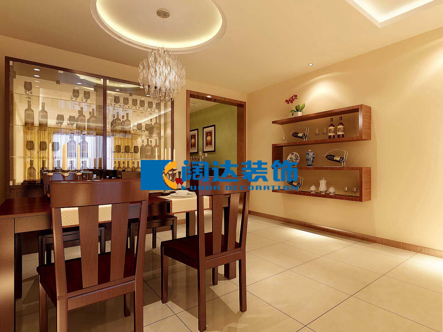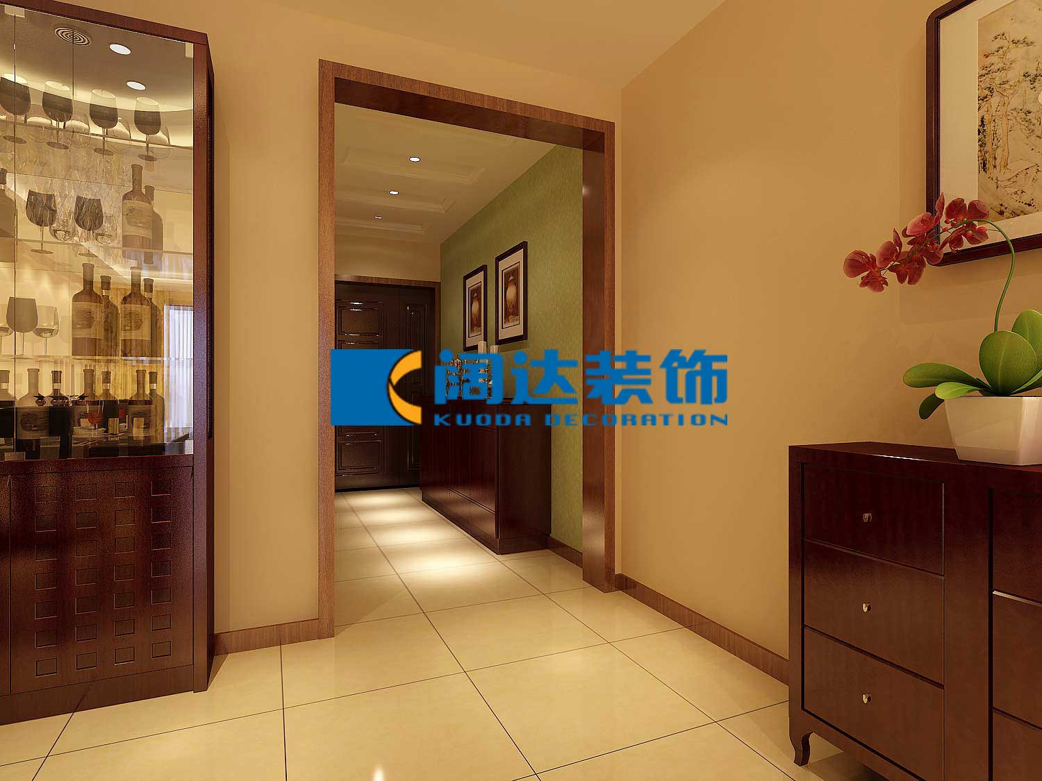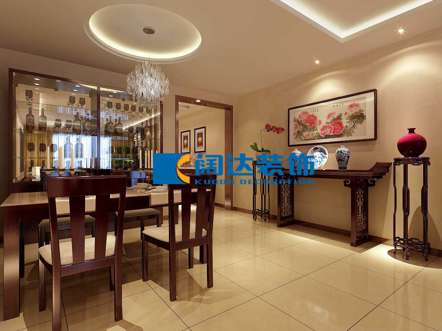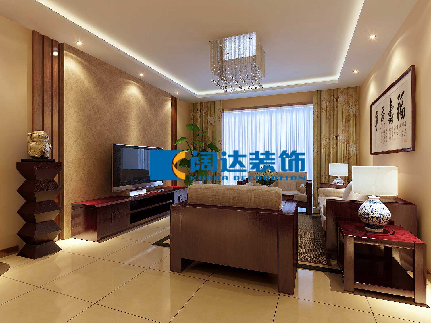 后期搭配窗簾,裝飾品,和水墨畫來增添室內的靈動感和室內整體空間塊體平衡比例的搭配和協調。通過色調,燈具,家具,裝飾品,掛畫等軟裝的設計把業主的品味和生活情趣體現在整個案例里。