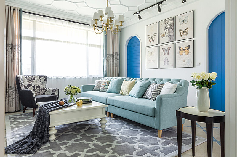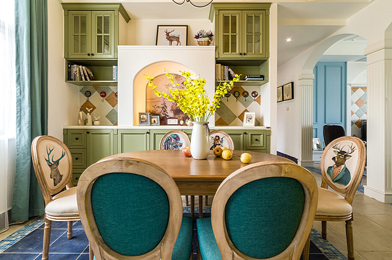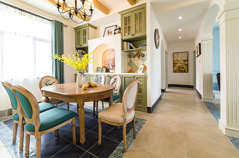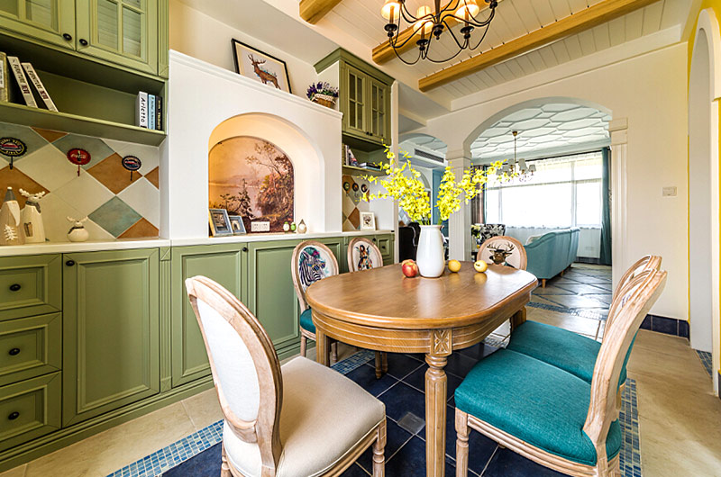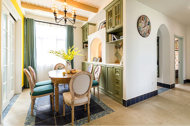本案中的130平米的三居室整體采用了地中海風(fēng)格裝修,并在清爽愜意的空間氛圍中融入了田園風(fēng)格的清新自然感,在色彩的選擇上也盡量的以清爽的藍(lán)色和富有活力的明黃色為主,并在餐廳中運用了象征著森林的墨綠色,為空間帶來靜謐之感的同時也增添了幾分自然的氣息。