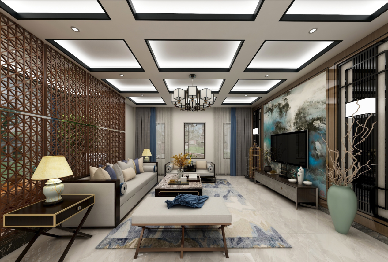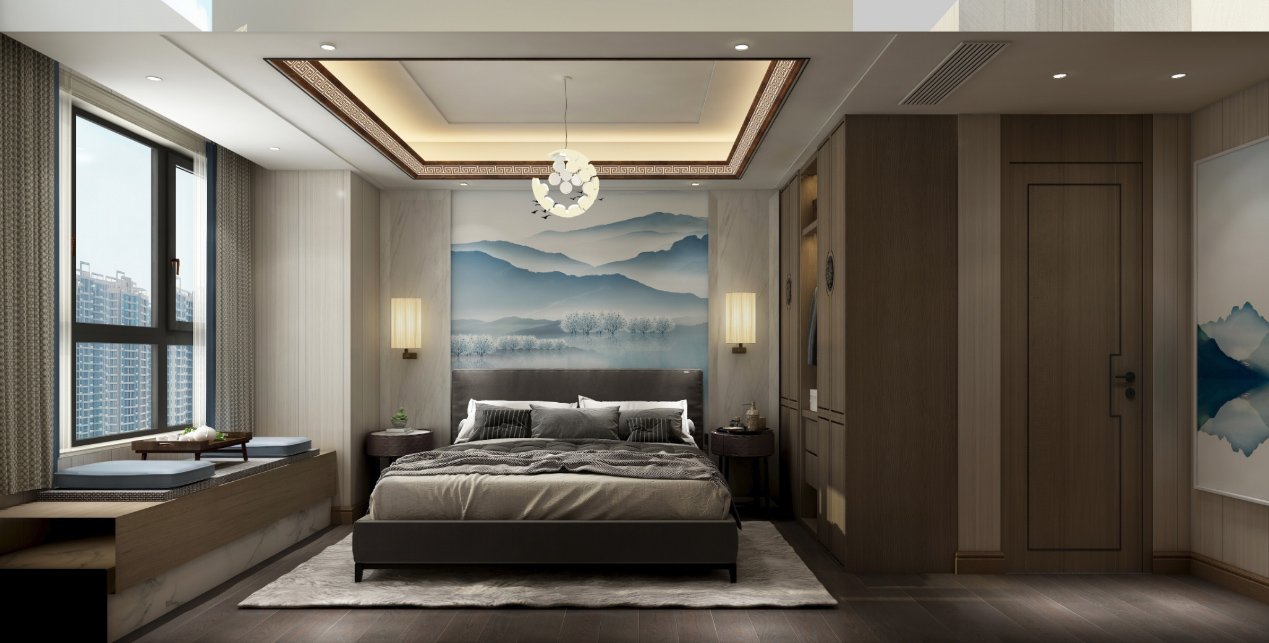 該房子的客廳面積非常大,吊頂造型上,男主人要求造型夸張一些,不要傳統(tǒng)的邊吊,影視墻造型采用傳統(tǒng)的三段式,規(guī)整又不失典雅,中心視角運用中國的水墨元素搭配方形壁燈,更能凸顯新中式的氣質(zhì)。主臥墻面采用素色墻布,增加墻面的肌理感,吊頂線條以中式深咖色實木線條為主,飄窗設(shè)計為休閑飄窗,空閑下來可以喝喝茶、看看書,面積雖小,不失生活的品味。同風(fēng)格案例:更多>>