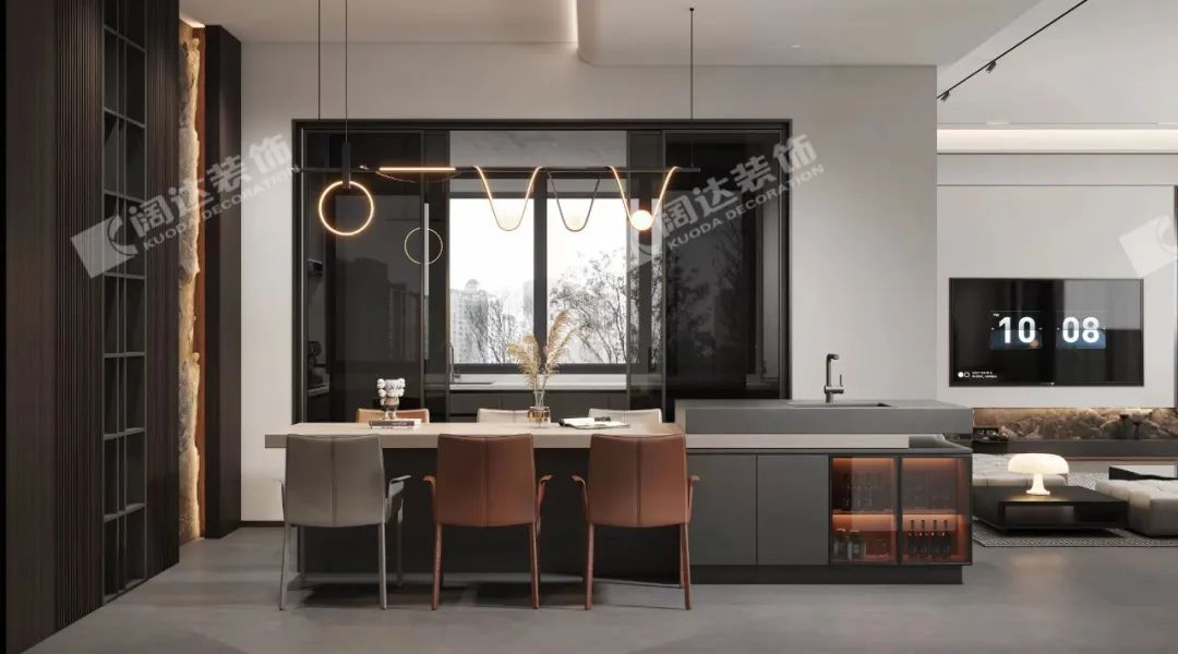 餐廳大島臺既可以作為日常的餐吧臺使用,又能滿足烹飪操作之需,柜體區域還能用作大容量收納空間。