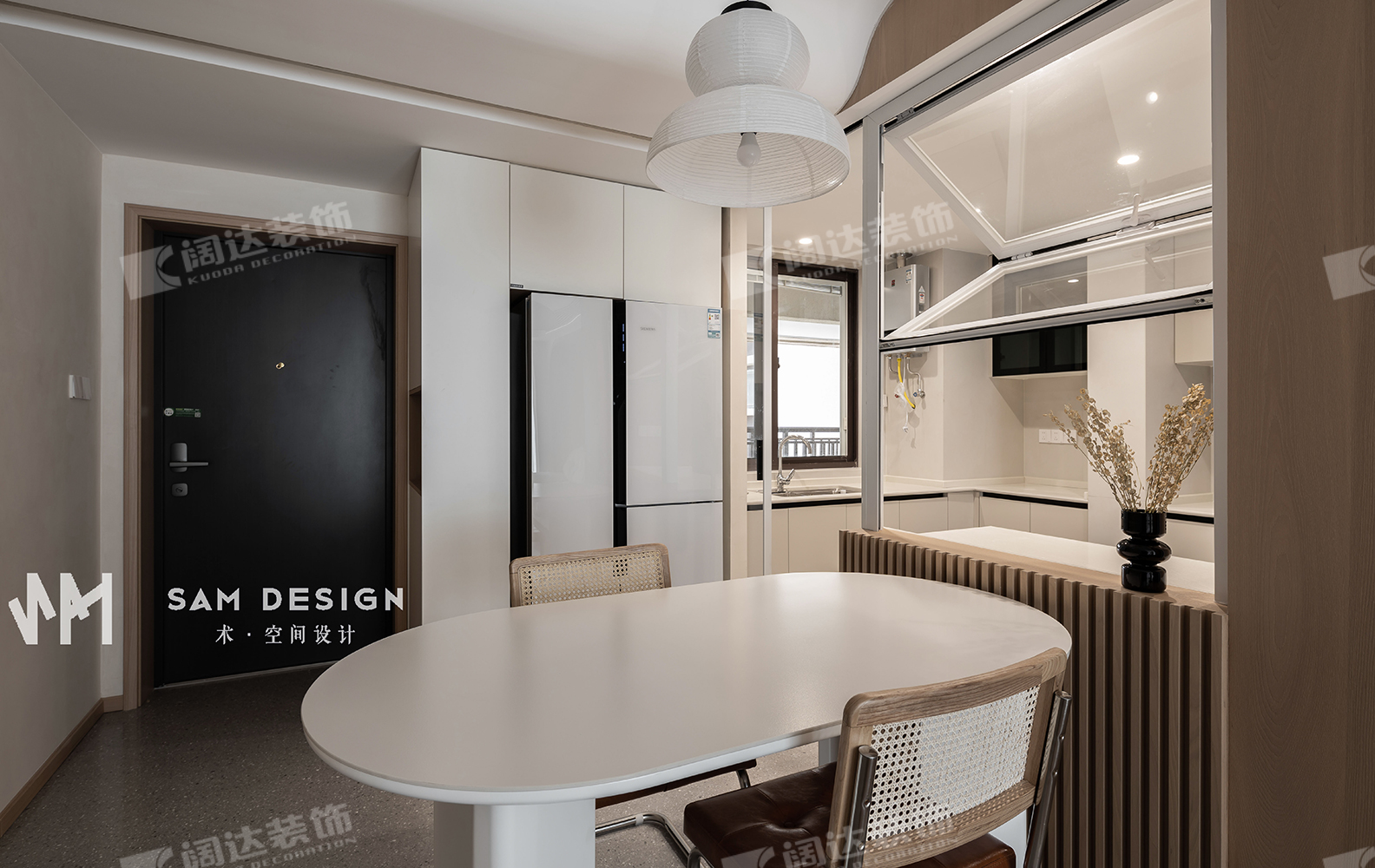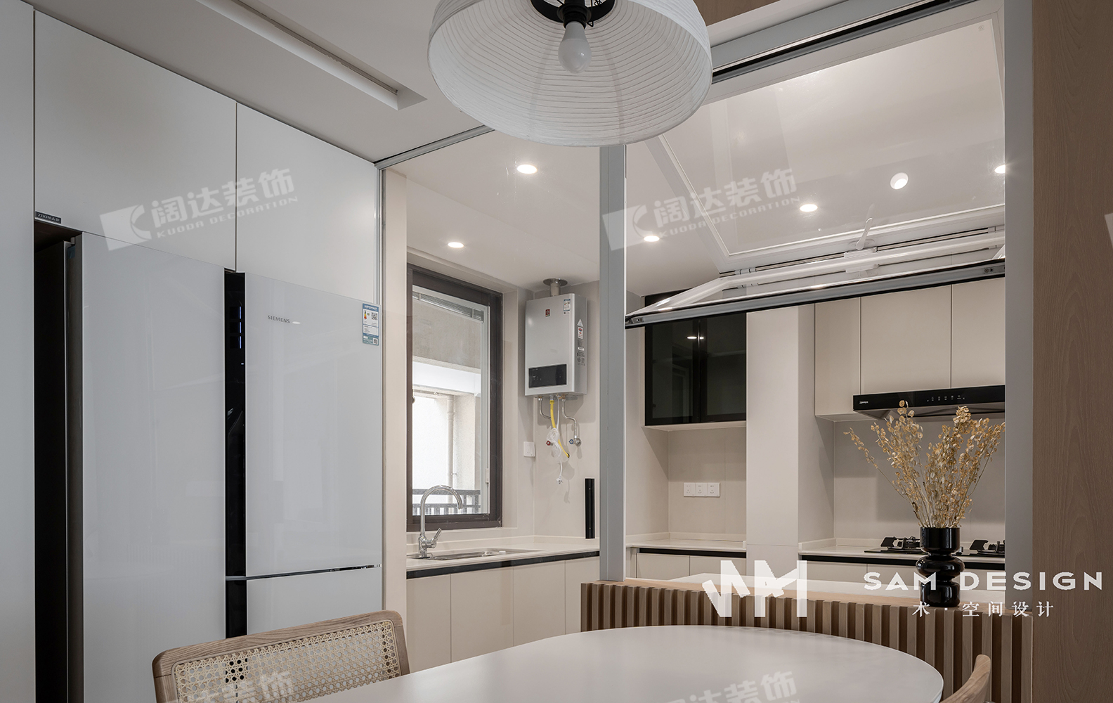 為了增大視覺以及活動空間,將餐廳的視角與西廚連為一體,中島式的設計在餐廳增加了社交趣味的同時,還增加了餐廳的儲物收納。