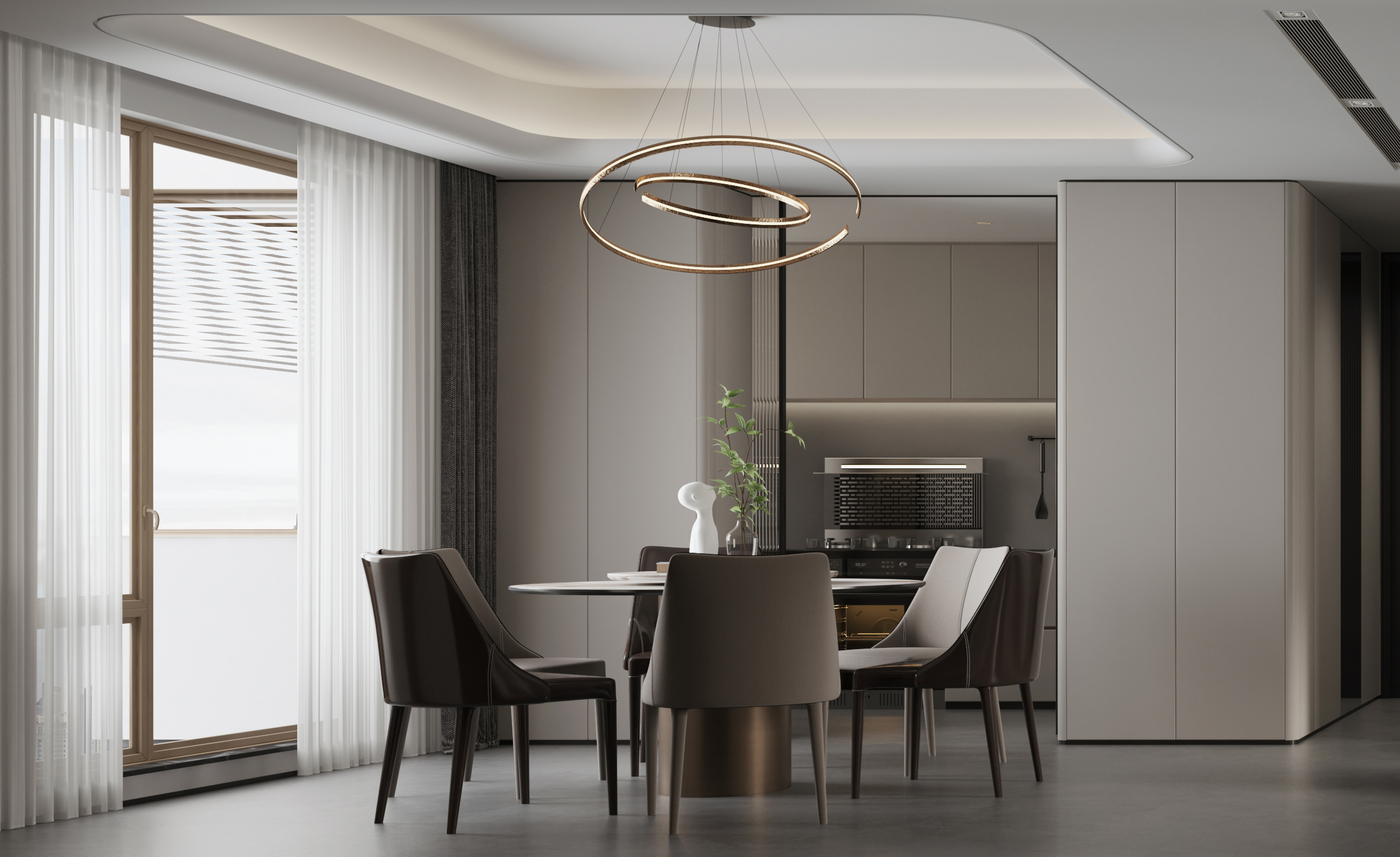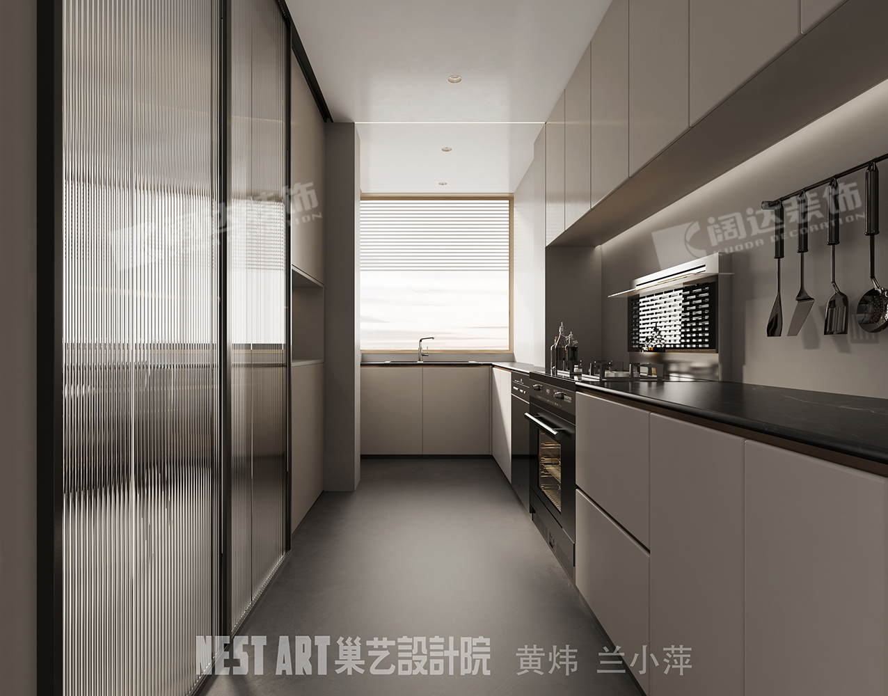 廚房區設計隱藏式推拉移門,增加了餐廚區空間延展性,也使烹飪空間更加靈活,餐廳區域空調冷氣使得廚房更加舒適。