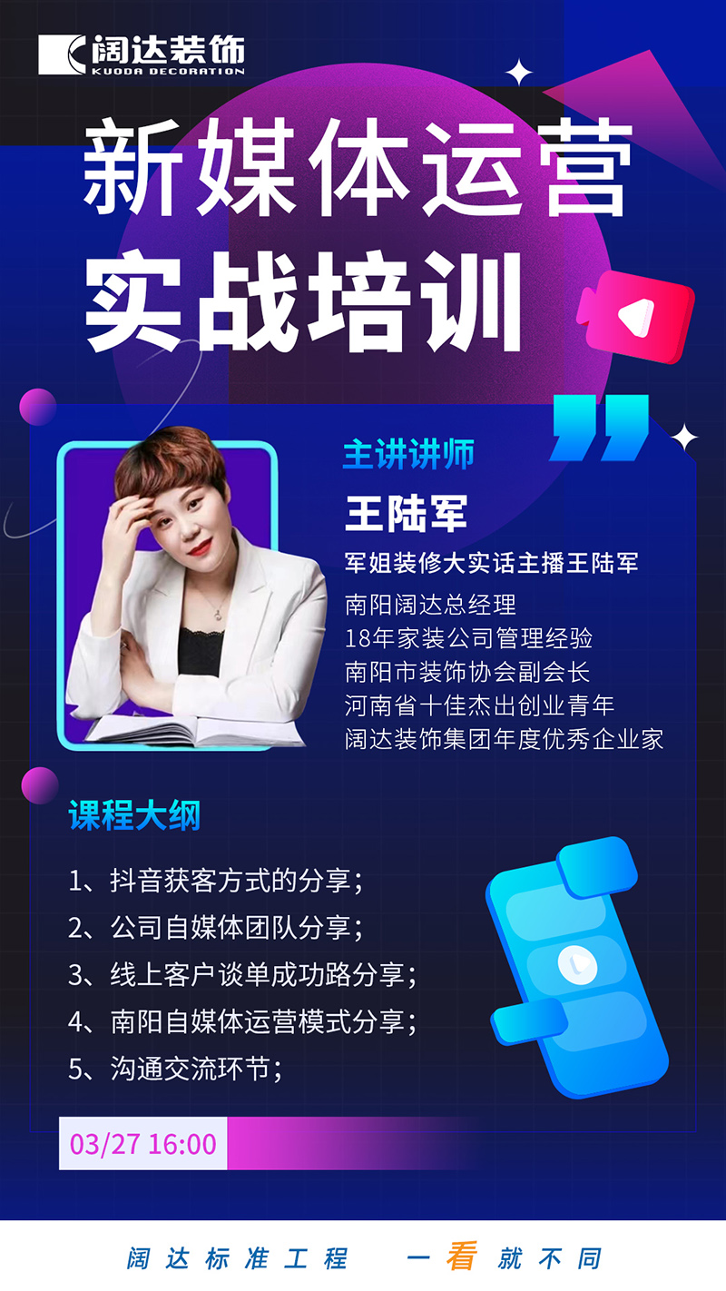 昨天下午,北京闊達裝飾總部進行了線上新媒體運營實戰培訓,特邀南陽闊達總經理王陸軍,主要針對闊達體系10余家企業陸續到南陽學習新媒體運營過程中,出現的各類問題以及總結的經驗與大家進行交流分享。