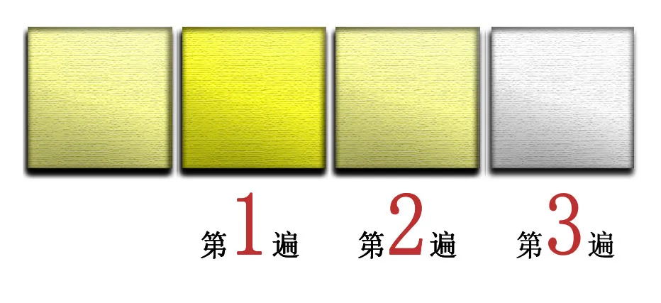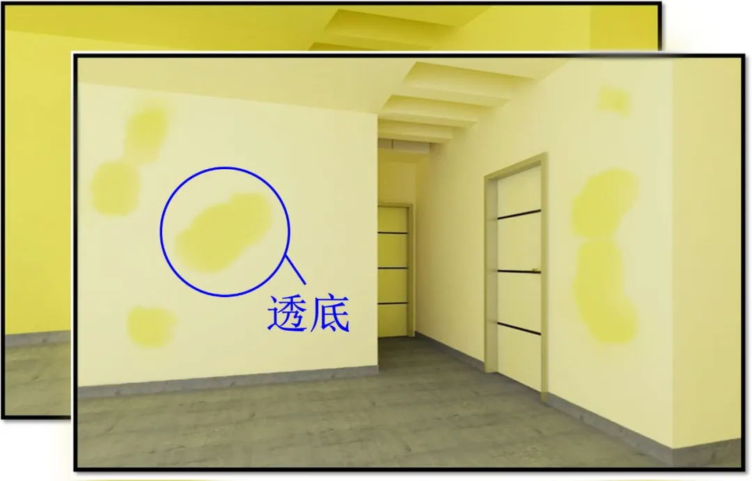 傳統(tǒng)的白色膩子是無法實現(xiàn)對乳膠漆涂刷遍數(shù)和涂刷濃度的自檢功能的。而闊達專利技術之一,黃色墻襯恰恰能實現(xiàn)這一功能。因為如果乳膠漆兌水比例超出標準范圍,在乳膠漆涂刷過程中,油工無論涂刷多少遍,這個黃色的墻襯也是遮蓋不住的,乳膠漆干燥后墻面是花的,一團一團的不規(guī)則的黃色,也就是俗稱的“透底”(見上圖示例)。