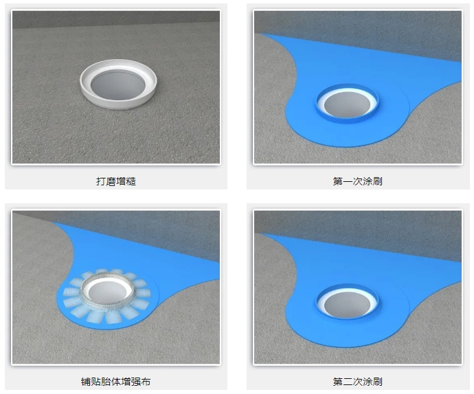 ②各下水管道根部與樓板搭接處,要在第一次涂刷防水涂料后鋪貼胎體增強布,而后才可以進行二次涂刷。此時,需要特別注意,在涂刷前,管道(PVC/鐵管)要打磨增糙/除銹。若管根與樓板搭接處有松動及裂縫,需開槽密封后,方可按照上述工序進行施工。